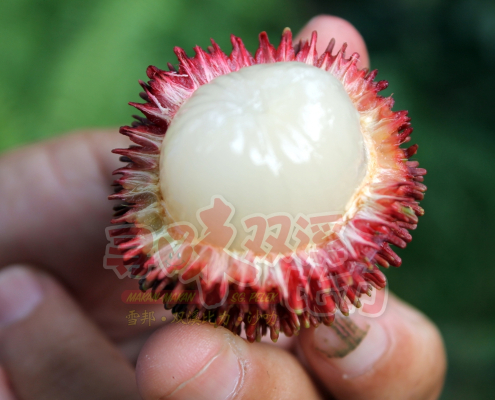 双溪比力万岗(Bangkong)刘小成住家式果园,种有18棵树龄超过30年的山荔枝。刘小成称,虽然外形不甚讨好,山荔枝肉厚多汁甜美犹胜过红毛丹。